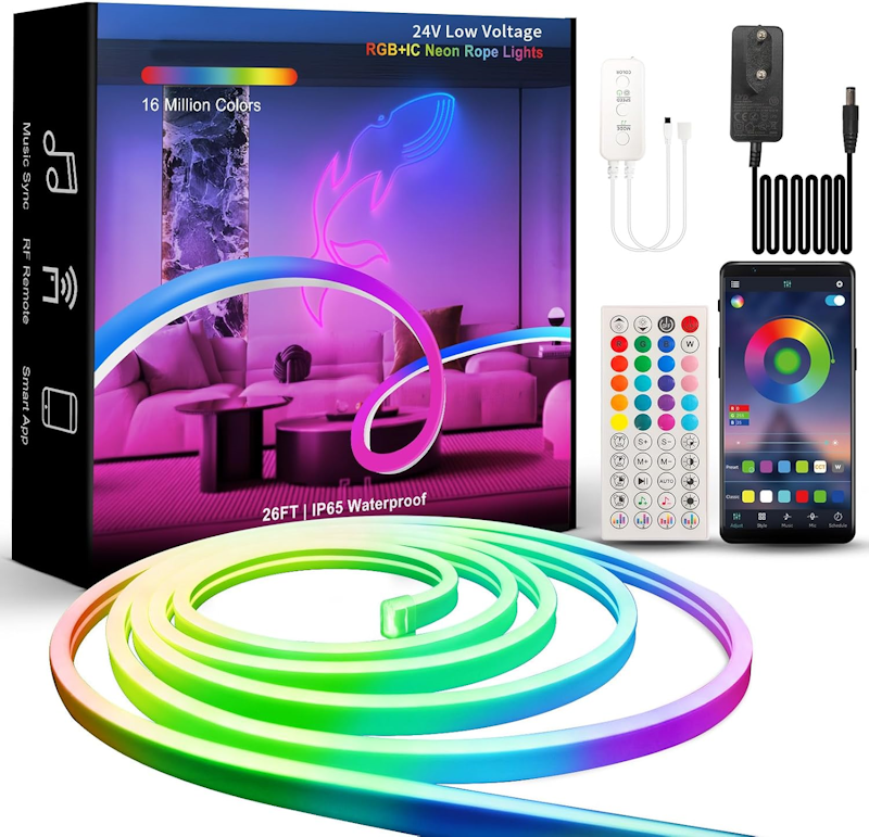 BUNACET Bande LED néon 8 m, RVB + IC, 768 LED avec télécommande et bloc d'alimentation, étanche IP65, synchronisation musicale, éclairage en silicone flexible 24 V pour décoration