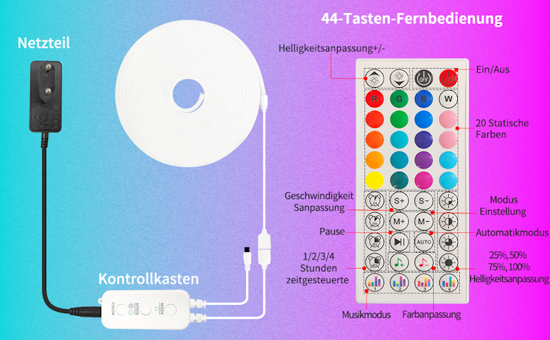 Sécurité d'utilisation et paquet complet : la bande lumineuse néon est alimentée par une basse tension de 24 V, sûre à utiliser. Coque en silicone de haute qualité, résistante aux températures élevées, non inflammable. Le paquet comprend 1 bande néon LED de 8 m, 1 bloc d'alimentation 24 V, 1 télécommande infrarouge, 1 capuchon, 1 récepteur à 3 clés, 16 clips de montage, 16 vis.