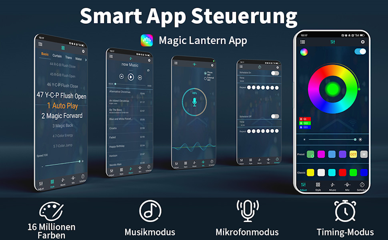 Contrôle par application intelligente : la bande LED néon peut être contrôlée par télécommande, contrôleur à 3 boutons et application. L'application Magic Lantern vous offre une expérience d'éclairage plus excitante avec 16 millions de schémas de couleurs DIY, 29 modes d'éclairage, 1 à 100 % de variation douce, de minuterie et de musique.
