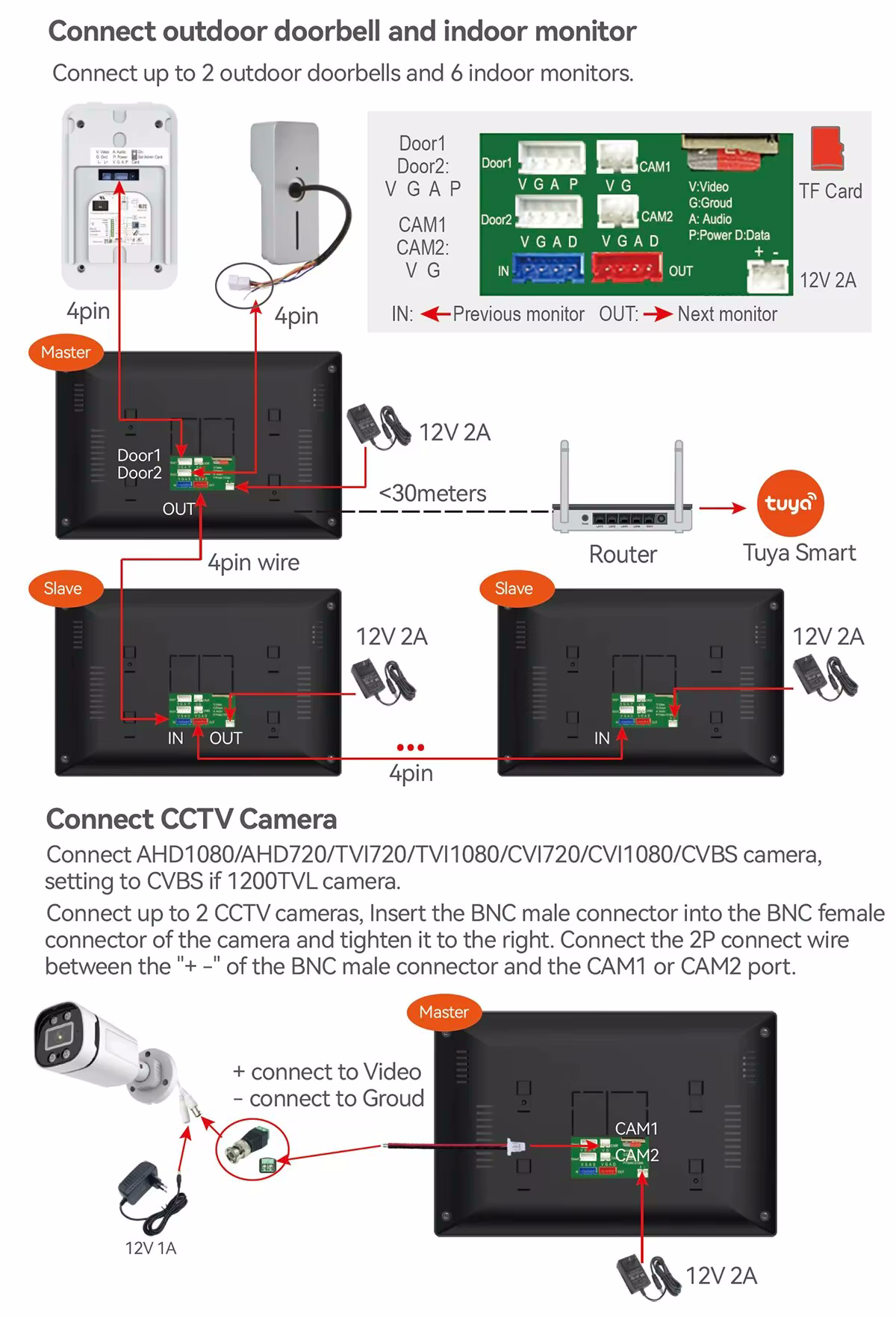【Connexion de plusieurs appareils】 Connectez jusqu'à 6 moniteurs, 2 sonnettes et 2 caméras CCTV. Communication bidirectionnelle entre le moniteur et la caméra, le moniteur et le moniteur. Renvoi d'appel entre tous les moniteurs. Ouvrez et déverrouillez la porte à partir de n'importe quel moniteur intérieur.