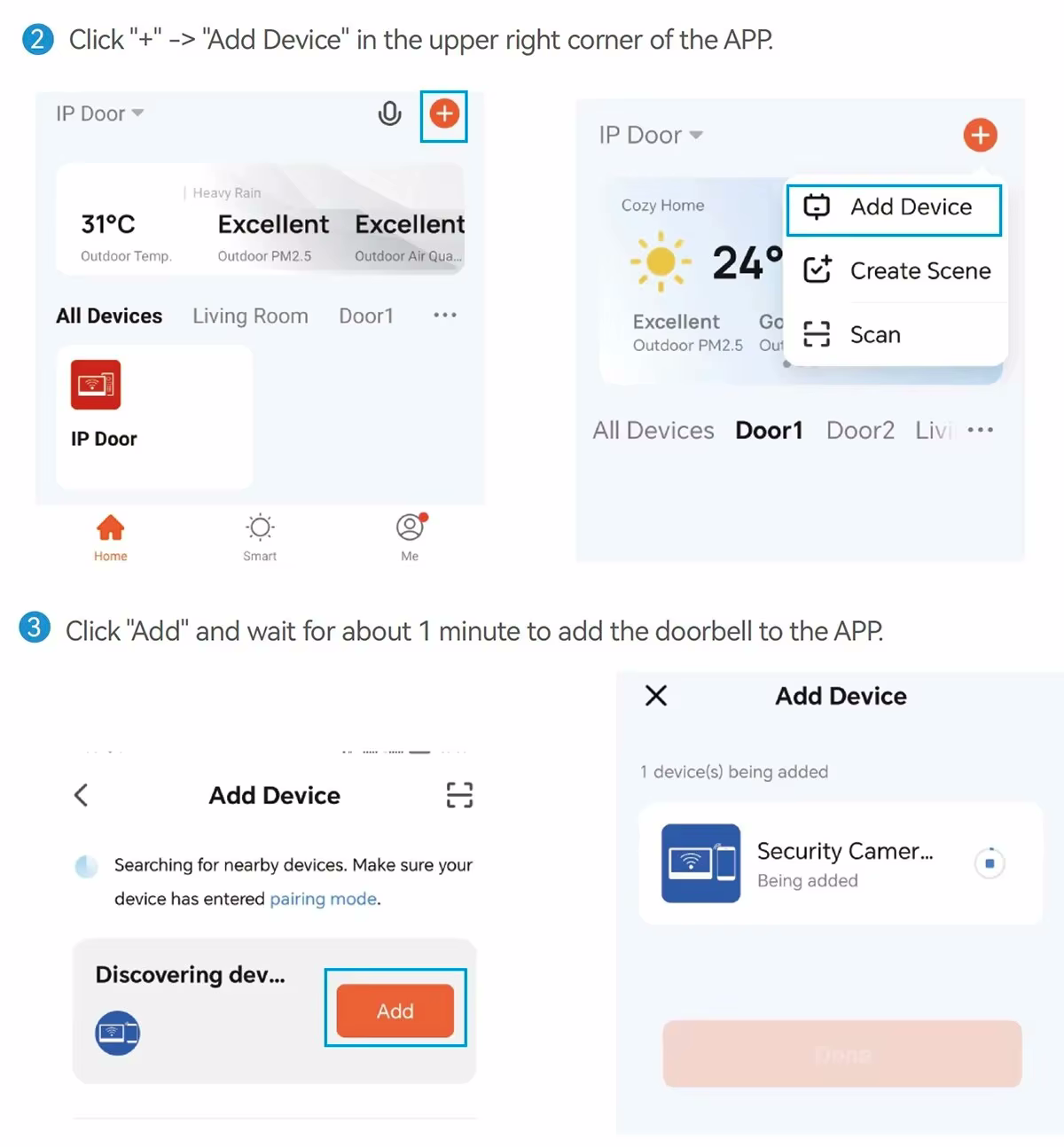 La sonnette sans fil communique facilement avec les visiteurs via l'application, qui prend en charge les smartphones et tablettes IOS/Android. Prend en charge le déverrouillage à distance, la surveillance, la communication bidirectionnelle, l'enregistrement vidéo, etc. Vous pouvez répondre à la porte dans votre main.