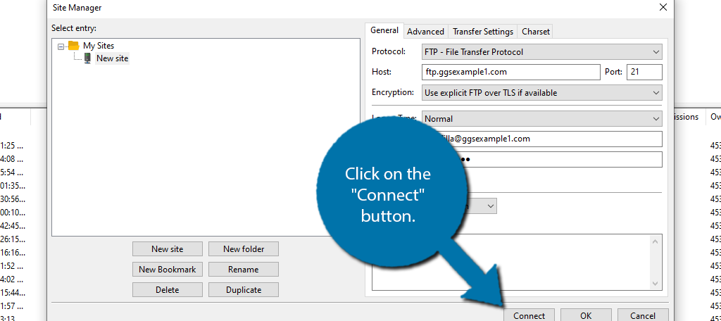 Dans l'onglet Général, vous pouvez maintenant saisir les informations de votre compte FTP. Cela l'ajoutera au gestionnaire de sites, afin que vous puissiez vous y connecter rapidement ou basculer entre d'autres sites enregistrés.