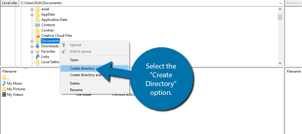 Le panneau de gauche représente votre ordinateur. Vous pouvez choisir de créer ce répertoire n'importe où sur votre ordinateur. Pour plus de simplicité, je vais le placer dans la zone Documents de mon ordinateur.