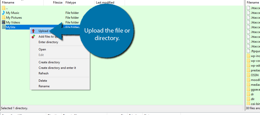 Pour télécharger un fichier, commencez par rechercher sur le côté droit (votre serveur Web) le répertoire dans lequel vous souhaitez télécharger le fichier. Une fois celui-