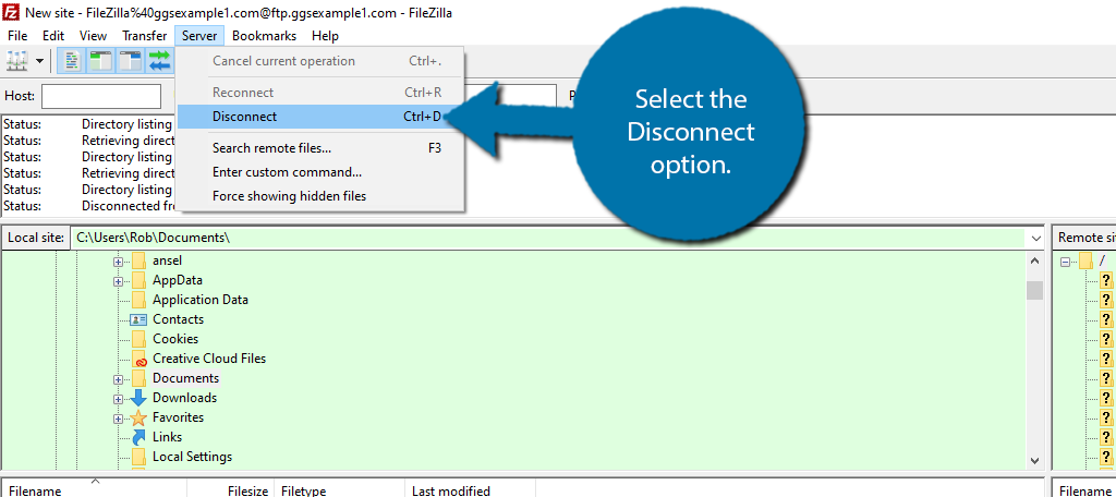 Une fois que vous avez fini d'utiliser FileZilla, vous devez vous déconnecter de votre serveur Web. Vous pouvez trouver cette option en cliquant sur l'option Serveur et en sélectionnant l'option Déconnecter. Vous pouvez également appuyer sur CTRL+D.
