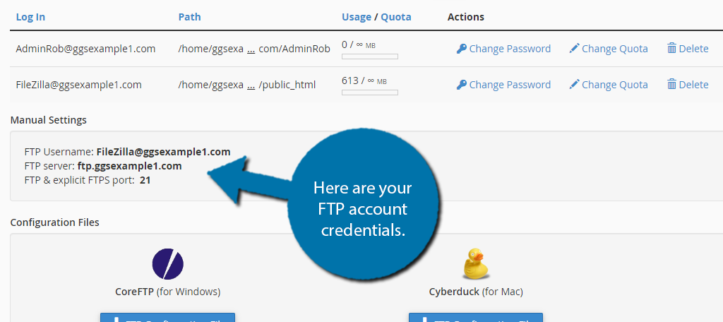 Remarque : auparavant, il était possible d'utiliser un fichier de configuration depuis cPanel pour connecter FileZilla et votre serveur Web, mais cette option a été supprimée. La saisie manuelle fonctionne toujours correctement.
