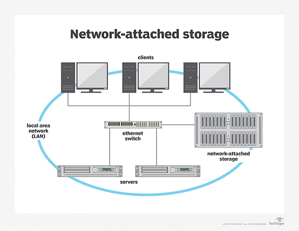 Le stockage en réseau (NAS) est un stockage de fichiers dédié qui permet à plusieurs utilisateurs et à des périphériques clients hétérogènes de récupérer des données à partir d'une capacité de disque centralisée. Les utilisateurs d'un réseau local (LAN) accèdent au stockage partagé via une connexion Ethernet standard.