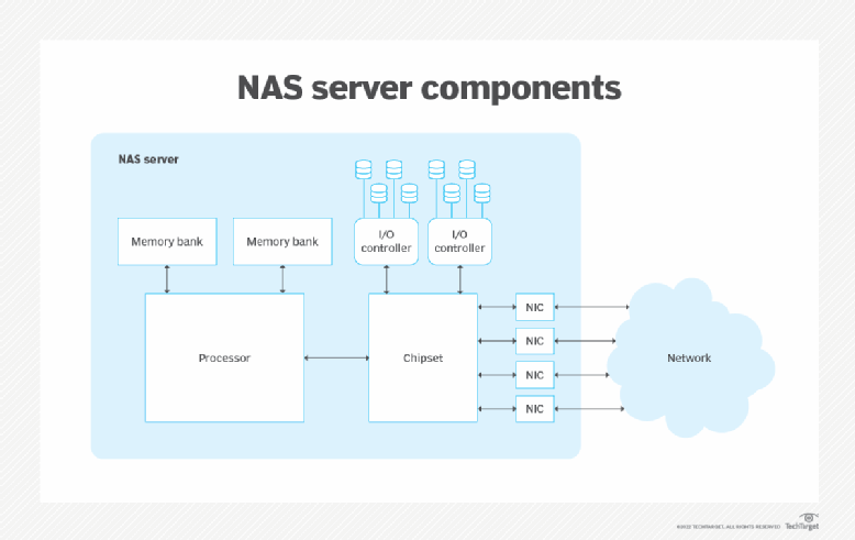 Processeur. Le cœur de chaque NAS est un ordinateur qui comprend l'unité centrale de traitement (CPU) et la mémoire. Le processeur est responsable de l'exécution du système d'exploitation NAS, de la lecture et de l'écriture des données sur le stockage, de la gestion des accès des utilisateurs et même de l'intégration au stockage cloud si cela est prévu. Alors que les ordinateurs ou serveurs classiques utilisent un processeur à usage général, un appareil dédié tel qu'un NAS peut utiliser un processeur spécialisé conçu pour des performances élevées et une faible consommation d'énergie dans les cas d'utilisation du NAS.