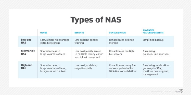 Certains produits NAS sont conçus pour être utilisés dans les grandes entreprises. D'autres sont destinés aux bureaux à domicile ou aux petites entreprises. Les appareils contiennent généralement au moins deux baies de lecteur, bien que des systèmes à baie unique soient disponibles pour les données non critiques. Les équipements NAS d'entreprise sont conçus avec des fonctionnalités de données plus haut de gamme pour faciliter la gestion du stockage et sont généralement livrés avec au moins quatre baies de lecteur.