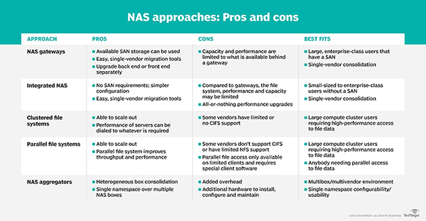 Diversification. Bien que les concepts de convergence SAN/NAS offrent un aperçu convaincant d'un avenir possible en matière de stockage, les entreprises peuvent se méfier des plateformes universelles. Les cas d'utilisation NAS se diversifient et les besoins de chaque cas d'utilisation spécifique doivent être soigneusement évalués. Certaines offres NAS sont bien adaptées aux sauvegardes et aux archives, mais peuvent ne pas posséder les attributs de performance, d'évolutivité et de fiabilité nécessaires à l'hébergement d'environnements virtualisés, à l'analyse de données, au calcul IA/ML et aux bases de données exigeantes. À mesure que la variété des produits NAS augmente, il est important pour les responsables informatiques et commerciaux de sélectionner la plateforme NAS qui répond le mieux aux besoins de la tâche à accomplir.