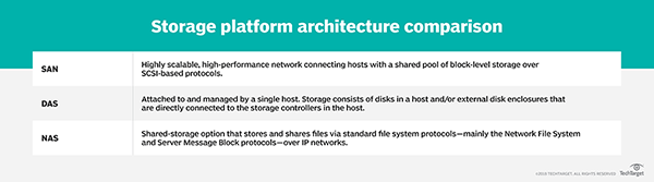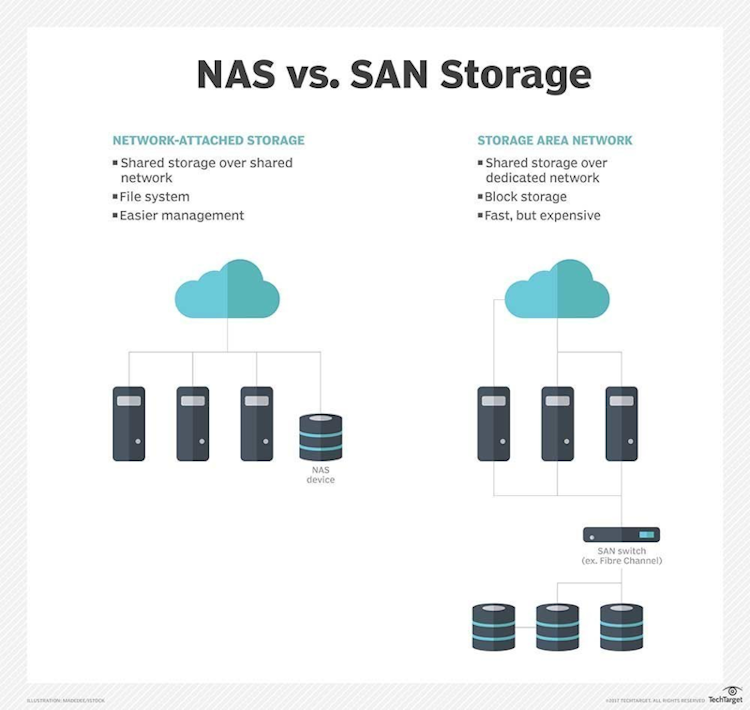 Bien que le NAS puisse être un périphérique unique, le SAN fournit un accès complet au niveau des blocs aux volumes de disque d'un serveur. En d'autres termes, un système d'exploitation client considère le NAS comme un système de fichiers, tandis qu'un SAN apparaît au disque comme le système d'exploitation client.