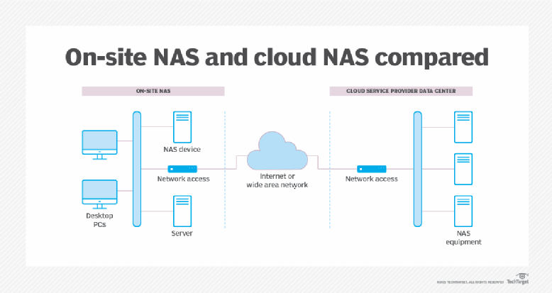 Le NAS sur site se connecte directement au réseau interne d'une organisation et est situé dans son centre de données. Les clients accèdent au NAS cloud d'un fournisseur de services via un réseau étendu ou Internet, et il est situé dans le centre de données du fournisseur.