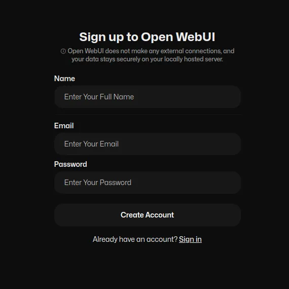 Créer un compte administrateur : le premier utilisateur à s'inscrire sur Open WebUI bénéficiera de privilèges d'administrateur. Ce compte disposera d'un contrôle complet sur l'interface utilisateur Web, y compris la possibilité de gérer d'autres utilisateurs et de configurer les paramètres.