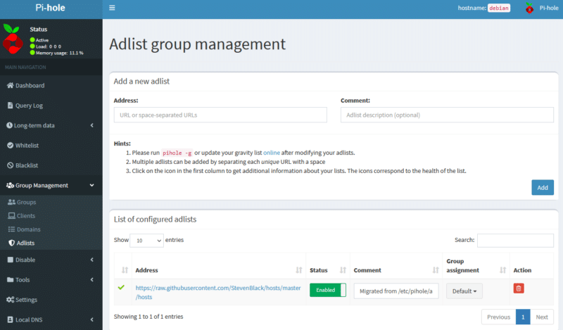 On voit bien notre première liste "StevenBlack", pour ajouter la notre, copiez le lien que je vous ai donné plus haut et insérez-