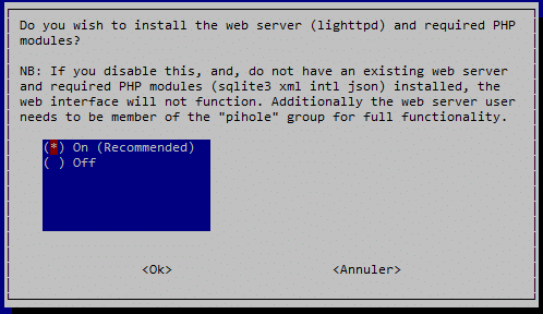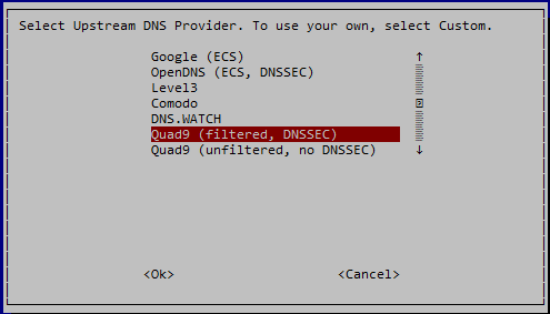 Suite à cet écran, vous aurez quelques messages d'informations puis vous arriverez à l'assistant de configuration qui vous demandera dans un premier temps à quel serveur DNS Pi-