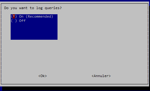 On vous demande ensuite si vous souhaitez enregistrer les demandes DNS, là c'est à vous de voir. Si vous souhaitez garder un historique, alors mettez oui, sinon, le contraire mais vous perdrez une partie des fonctionnalités (voir écran suivant).