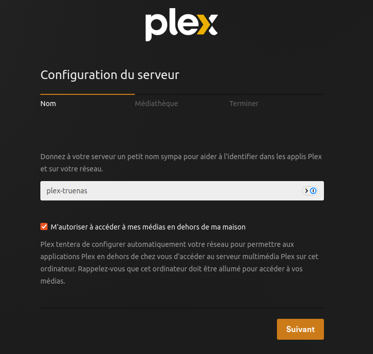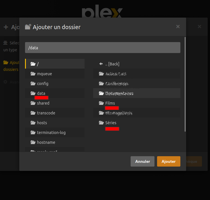 On peut donc se laisser guider par le wizard de configuration de Plex Media Server, lui donner un nom mignon et aller chercher nos médiathèques dans /data. Normalement, le dossier que vous avez donné lors de l’étape Storage configuration devrait apparaitre.