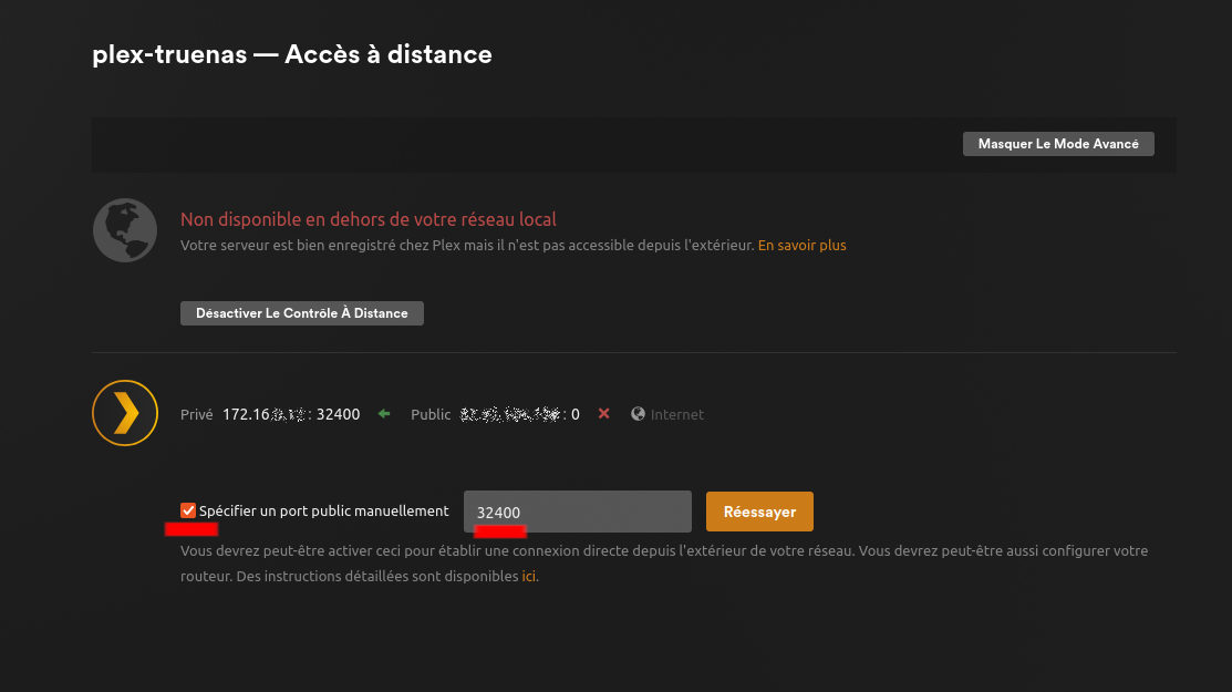 Pour une raison que j’ignore (peut être parce que c’est un container avec un adressage à part), j’ai dû explicitement indiquer le port public (32400 sur ma box, qui redirige sur l’IP de mon NAS et le port 32400) pour que le Control à distance fonctionne et que l’accès direct (sur le réseau local) fonctionne correctement.