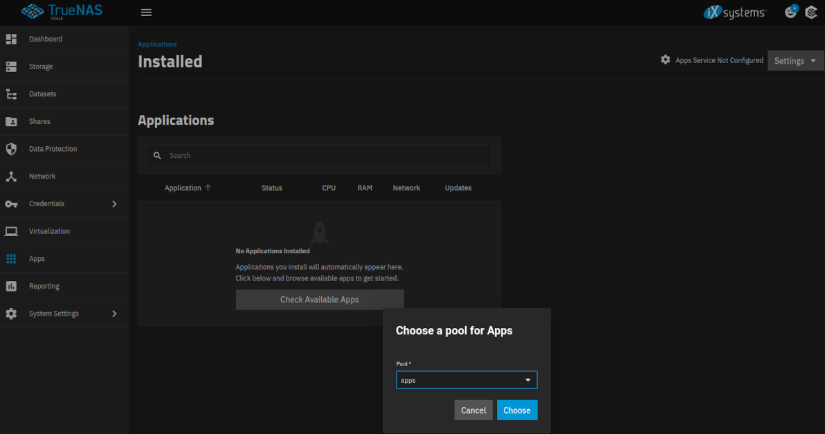 Par défaut, TrueNAS n’active pas les “apps”. Ca va être à nous de le faire. En soit, ce n’est pas forcément un mal : si vous n’en avez pas besoin aucune raison de consommer des ressources pour rien.
