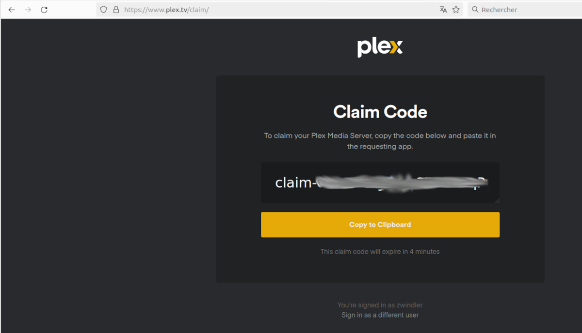 A partir de là, une fenêtre avec plein de paramètres va apparaitre. Mais avant d’aller plus loin, on va aller sur la page www.plex.tv/claim/. Une fois loggué sur votre compte, la page va vous générer un token temporaire, qui va permettre de relier directement le serveur une fois qu’il aura démarré sur votre NAS avec votre compte. Pratique !