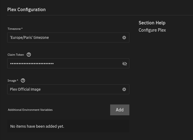 Dans la looongue page de configuration, on a que quelques paramètres à changer. D’abord, il faut renseigner le token qu’on vient de générer dans la section Plex Configuration. Si vous avez le Plex pass, vous pouvez aussi changer Image :