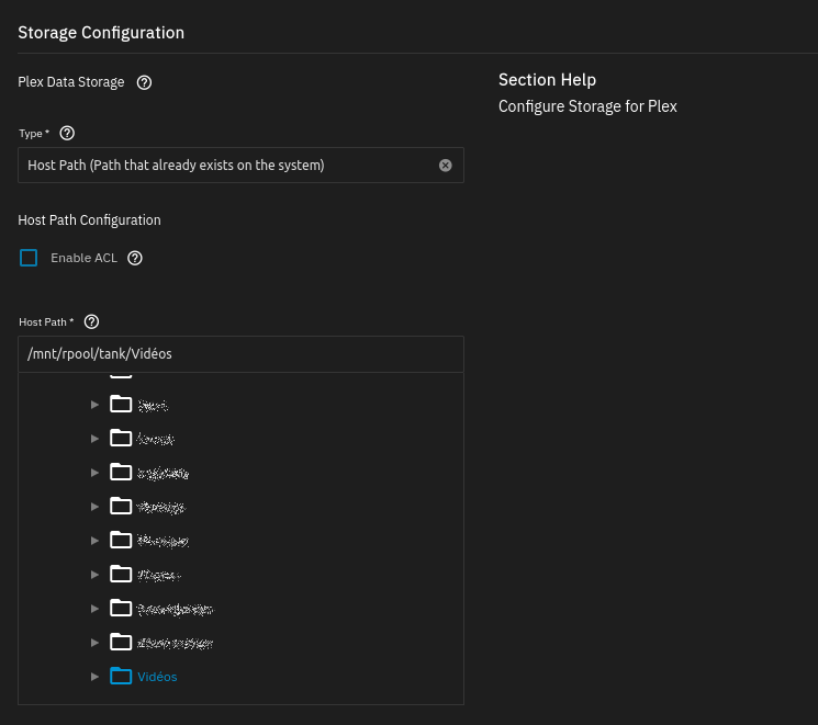 Ensuite, dans la partie Storage configuration, il va falloir indiquer le chemin vers le pool qui contient les médias. Moi c’est /mnt/rpool/tank/Vidéos. rpool est le nom de mon pool RAID-