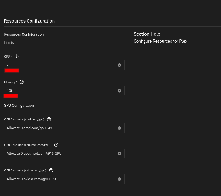 De manière optionnelle, vous pouvez tuner les “limits” (au sens docker/kubernetes du terme) de votre app. Par défaut, la chart plex de TrueNAS propose 4 CPUs et 8 Go de RAM, ce qui est beaucoup. Mon plex ne consomme que 100 Mo au repos. J’ai baissé à 2 CPUs (avec un risque de throttling, mais là on rentre dans des notions un peu tricky de Kubernetes que je préfère esquiver aujourd’hui dans cet article) et 4 Gio de RAM (j’en ai 16 mais je veux garder le plus de cache possible).