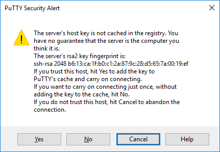 Lors de votre première connexion à un serveur, vous verrez probablement une PuTTY Security Alertboîte de dialogue indiquant que la clé d'hôte du serveur n'est pas mise en cache dans le registre. Ce phénomène est normal lors de votre première connexion. Si ce problème survient, cela peut signifier que quelqu'un tente d'attaquer votre connexion et de voler votre mot de passe par une attaque de l'homme du milieu .