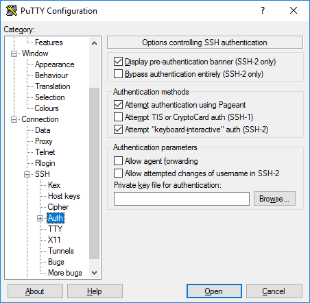 L'une des fonctionnalités intéressantes de PuTTY est la prise en charge de l'authentification unique Active Directory . Techniquement, elle utilise le protocole Kerberos via une interface de programmation appelée GSSAPI . Dans le protocole SSH, ce mécanisme est appelé authentification GSSAPI. Les utilisateurs d'entreprise utilisant l'authentification Kerberos (par exemple, via les services d'authentification Centrify ou Quest, également appelés Vintela) peuvent souhaiter bénéficier de cette authentification unique. Les autres utilisateurs n'ont pas à s'en soucier. Les paramètres d'authentification GSSAPI se trouvent dans la section SSH / Authentification . Notez que vous devez à nouveau développer la section Authentification en cliquant sur le [+]symbole pour afficher les options GSSAPI.