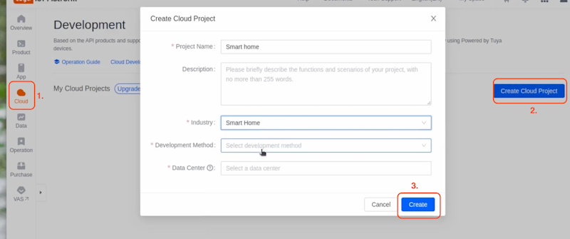 Une fois connecté, cliquez sur l’icône « Cloud » dans la barre de menu de gauche, puis cliquez sur « Créer un projet Cloud »