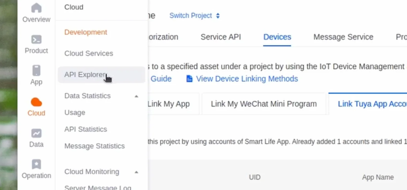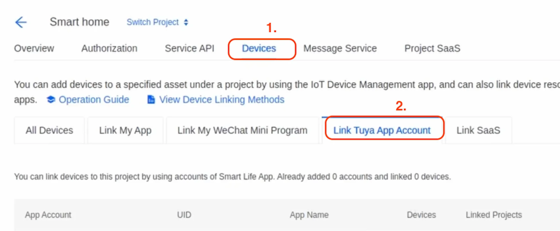 Une fois le projet créé, cliquez sur l’onglet « Appareils » puis sur « Lier l’application Tuya ».