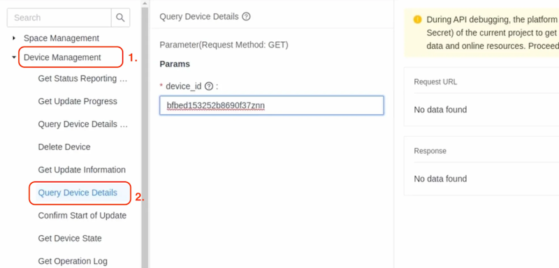 Maintenant, dans ce nouvel onglet, cliquez sur « Gestion des appareils » dans le panneau de gauche, puis cliquez sur « Interroger les détails de l'appareil », entrez l'ID de votre appareil Tuya et cliquez sur « Soumettre la demande »