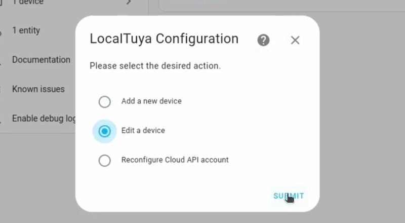 Pour cela, vous pouvez à nouveau vous rendre sur l'intégration locale Tuya, cliquer sur « Configurer » puis cette fois sélectionner « Modifier un appareil »