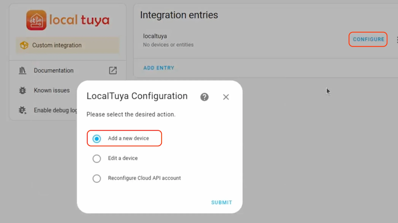 Pour cela, nous allons ouvrir l’intégration locale Tuya et cliquer sur « Configurer » puis sélectionner l’action « Ajouter un nouvel appareil ».