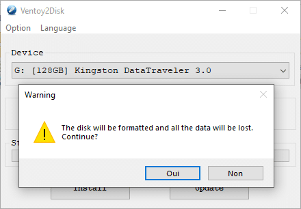 5_Une fois que ceci est fait, vous pouvez lancer la préparation de la clé en cliquant sur « Install ». Vous devrez confirmer que vous êtes bien conscient que les données de la clé USB seront perdues.