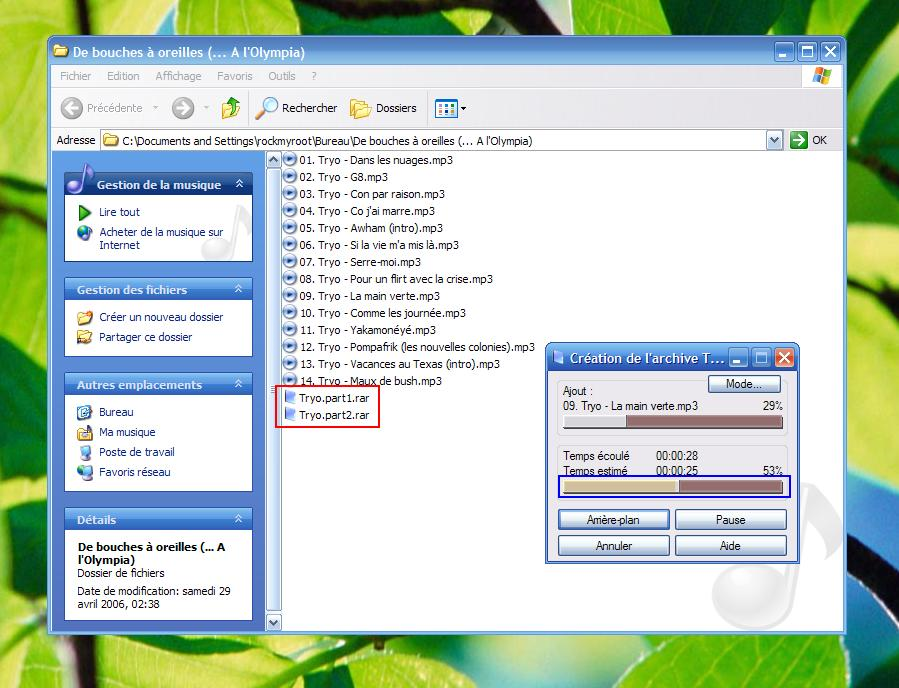 Remarquez que l'achive se coupe en deux parties, de 25Mo chacune.