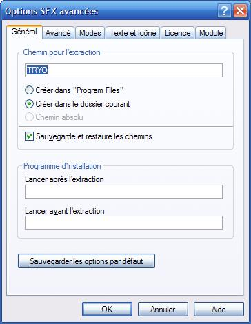 Apparait cette fenêtre (à droite). Le chemin pour l'extraction correspond à l'endroit ou sera extrait par défaut le contenu de vos archive SFX. Il sera possible bien évidemment de le changer lors de l'exécution de l'exe. Spécifiez juste un nom de dossier. Par exemple, si vous cochez l'option Créer dans program files, et que vous spécifiez un nom de dossier s'appelant TRYO, l'archive sera extraire dans C:files. Si vous cochez Créer dans le dossier courant, l'archive sera alors extraite dans un dossier TRYO dans le dossier contenant actuellement votre archive. Vous arrivez à suivre? Bien, continuons.