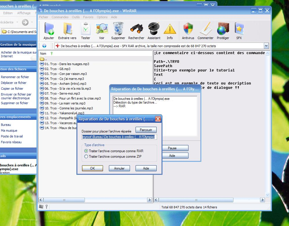 Attention !!! Cette technique n'est "bien" que pour une archive en un seul morceau. Si vous essayez de réparer une archive "découpée" en X parties, ce que contient l'ensemble de ces archives seront parfois ajoutés X fois dans la nouvelle archive. Par exemple, je compresse un film de 700Mo en créant 30 archives. Et bien lors de la réparation, winRAR va récréer 30 fois le fichier de 700Mo prenant au passage 700Mo*30, c'est à dire 21Go... mais cela arrive rarement... ^^