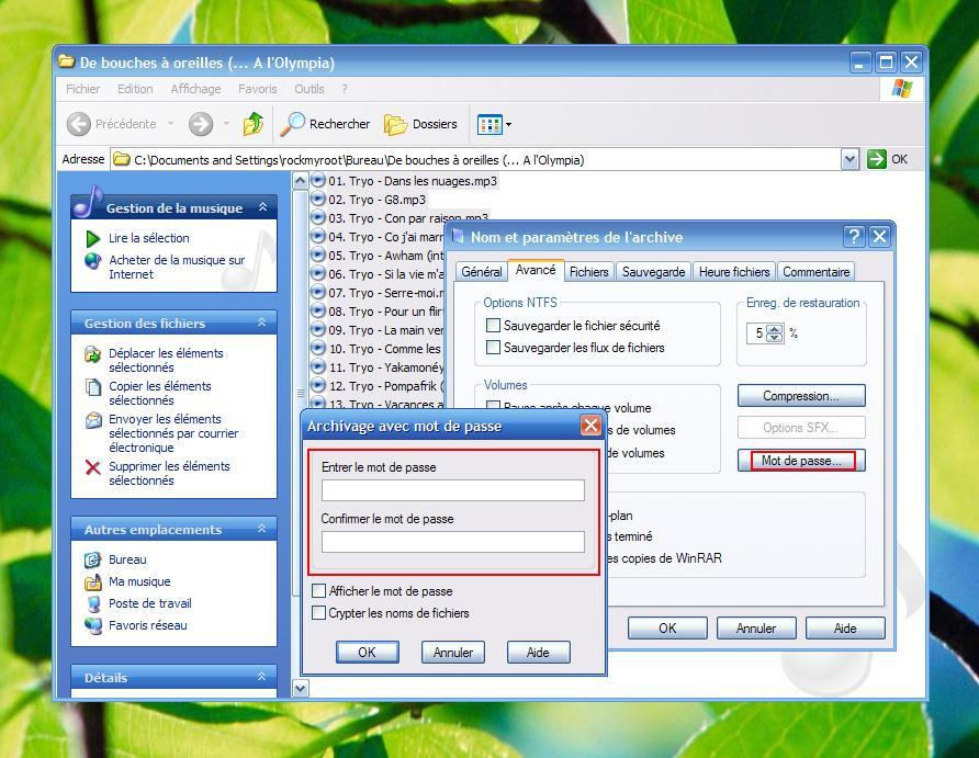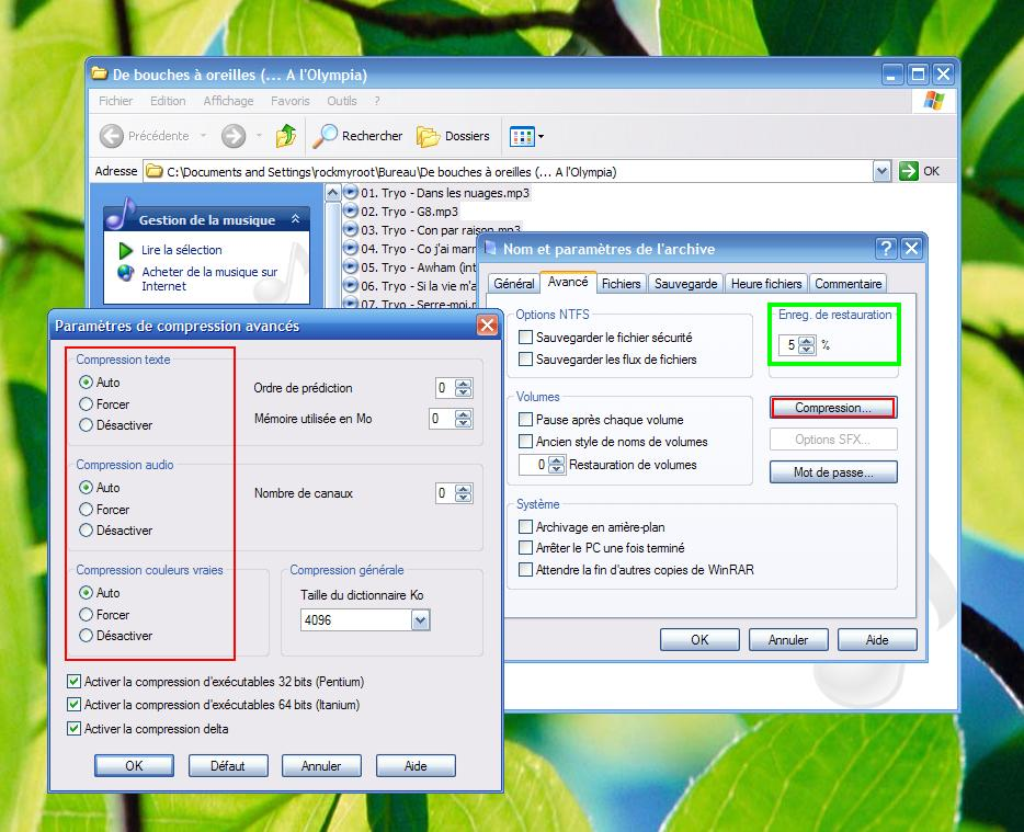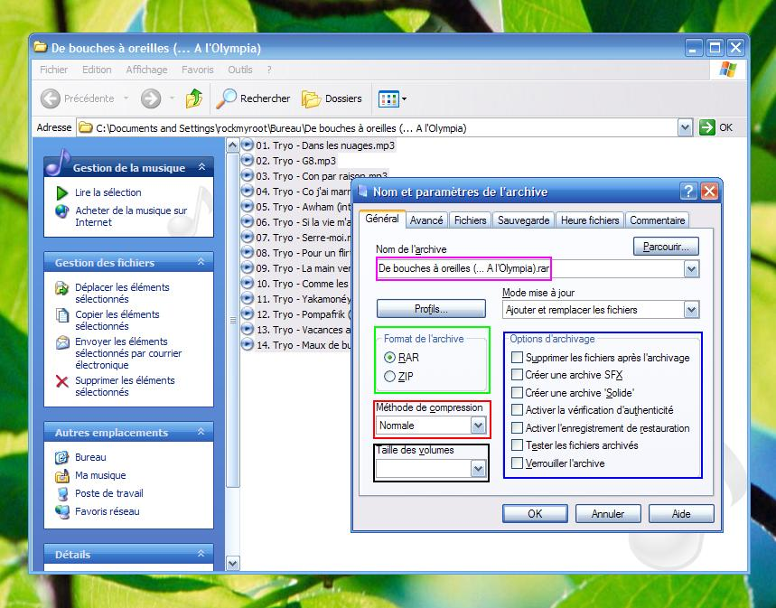 Entouré en vert, le format. Le format .rar est bien sur le plus recommandé pour pouvoir utiliser les deux options qui suivent.